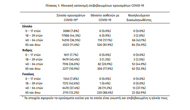 Τέλος, έχουμε 7 ακόμα καταγεγραμμένους θανάτους και 642 θανάτους συνολικά στη χώρα. 248 (38.6%) γυναίκες και οι υπόλοιποι άνδρες. Η διάμεση ηλικία των θανόντων συμπολιτών μας ήταν τα 79 έτη και το 96.3% είχε κάποιο υποκείμενο νόσημα ή/και ηλικία 70 ετών και άνω.