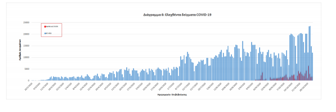 Δείγματα που έχουν ελεγχθεί: Από την 1η Ιανουαρίου 2020 μέχρι σήμερα, στα εργαστήρια που διενεργούν ελέγχους για τον νέο κορωνοϊό (SARS-CoV-2) και που δηλώνουν συστηματικά στον ΕΟΔΥ το σύνολο των δειγμάτων που ελέγχουν, έχουν συνολικά ελεγχθεί 1804016 κλινικά δείγματα ενώ από Μονάδες Υγείας και Κλιμάκια του ΕΟΔΥ που διενεργούν ελέγχους Rapid Ag έχουν ελεγχθεί 74518 δείγματα.
