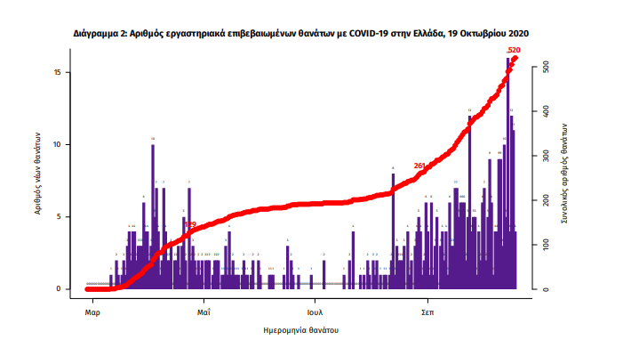 Τα στοιχεία που παρουσιάζονται αφορούν περιστατικά από την επιδημιολογική επιτήρηση της νόσου από το νέο κορωνοϊό (COVID19), με βάση τα δεδομένα που έχουν δηλωθεί στον ΕΟΔΥ και καταγραφεί μέχρι τις 19 Οκτωβρίου 2020 (ώρα 15:00). Τα νέα εργαστηριακά επιβεβαιωμένα κρούσματα της νόσου είναι 438, εκ των οποίων 62 συνδέονται με γνωστές συρροές και 42 εντοπίστηκαν κατόπιν ελέγχων στις πύλες εισόδου της χώρας. Ο συνολικός αριθμός των κρουσμάτων ανέρχεται σε 25802 (ημερήσια μεταβολή +1.7%), εκ των οποίων 55.6% άνδρες. 1 Οι νέοι θάνατοι ασθενών με COVID-19 είναι 11, ενώ από την έναρξη της επιδημίας έχουν καταγραφεί συνολικά 520 θάνατοι.Η διάμεση ηλικία των ασθενών που απεβίωσαν είναι 79 έτη. Ο αριθμός των ασθενών που νοσηλεύονται διασωληνωμένοι είναι 85 (69.4% άνδρες). Η ημερήσια κατανομή των επιβεβαιωμένων κρουσμάτων είναι η ακόλουθη (η γραμμή παριστάνει την συνολική, αθροιστική κατανομή των κρουσμάτων).