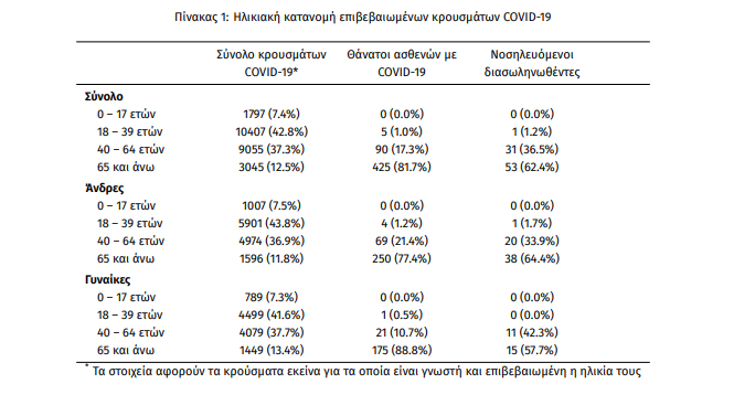 Τέλος, έχουμε 11 ακόμα καταγεγραμμένους θανάτους και 520 θανάτους συνολικά στη χώρα. 197 (37.9%) γυναίκες και οι υπόλοιποι άνδρες. Η διάμεση ηλικία των θανόντων συμπολιτών μας ήταν τα 79 έτη και το 96.2% είχε κάποιο υποκείμενο νόσημα ή/και ηλικία 70 ετών και άνω.