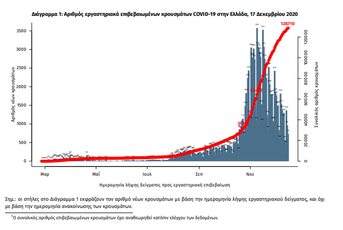 Τα στοιχεία που παρουσιάζονται αφορούν περιστατικά από την επιδημιολογική επιτήρηση της νόσου από το νέο κορωνοϊό (COVID19), με βάση τα δεδομένα που έχουν δηλωθεί στον ΕΟΔΥ και καταγραφεί μέχρι τις 17 Δεκεμβρίου 2020 (ώρα 15:00). Τα νέα εργαστηριακά επιβεβαιωμένα κρούσματα της νόσου είναι 1155, εκ των οποίων 8 εντοπίστηκαν κατόπιν ελέγχων στις πύλες εισόδου της χώρας. Ο συνολικός αριθμός των κρουσμάτων ανέρχεται σε 128710 (ημερήσια μεταβολή +0.9%), εκ των οποίων 52.5% άνδρες. 1 Οι νέοι θάνατοι ασθενών με COVID-19 είναι 78, ενώ από την έναρξη της επιδημίας έχουν καταγραφεί συνολικά 3948 θάνατοι.Η διάμεση ηλικία των ασθενών που απεβίωσαν είναι 79 έτη. Ο αριθμός των ασθενών που νοσηλεύονται διασωληνωμένοι είναι 542 (69.6% άνδρες). Η ημερήσια κατανομή των επιβεβαιωμένων κρουσμάτων είναι η ακόλουθη (η γραμμή παριστάνει την συνολική, αθροιστική κατανομή των κρουσμάτων).