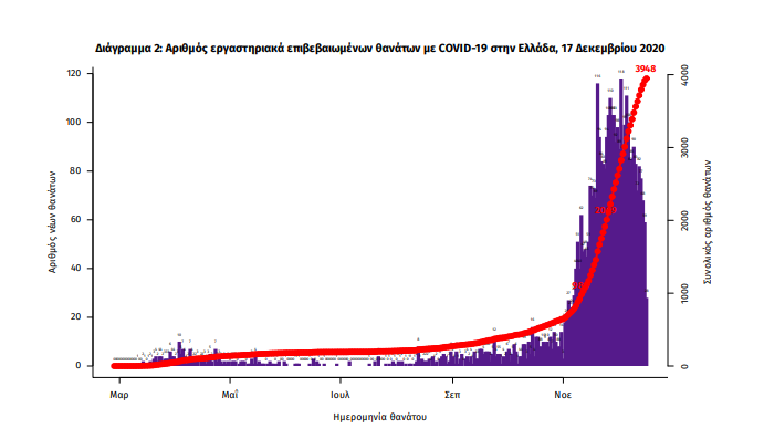 Τέλος, έχουμε 78 ακόμα καταγεγραμμένους θανάτους και 3948 θανάτους συνολικά στη χώρα. 1585 (40.1%) γυναίκες και οι υπόλοιποι άνδρες. Η διάμεση ηλικία των θανόντων συμπολιτών μας ήταν τα 79 έτη και το 95.6% είχε κάποιο υποκείμενο νόσημα ή/και ηλικία 70 ετών και άνω.