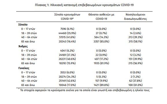 Η διάμεση ηλικία των κρουσμάτων είναι 44 έτη (εύρος 0.2 έως 104 ετών), ενώ η διάμεση ηλικία των θανάτων είναι 79 έτη (εύρος 25 έως 103 ετών). Η ηλικιακή κατανομή των (α) συνολικών κρουσμάτων, (β) των περιστατικών που κατέληξαν σε θάνατο και (γ) των ασθενών που νοσηλεύονται διασωληνωμένοι, είναι η ακόλουθη: