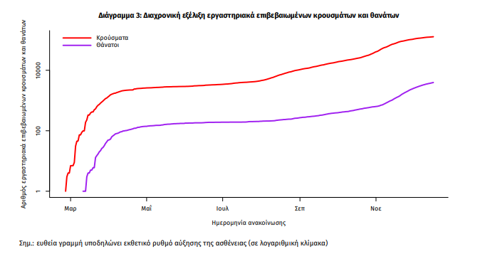 Η διαχρονική εξέλιξη των συνολικών κρουσμάτων και συνολικού αριθμού των θανάτων ασθενών COVID-19 παρουσιάζεται στο ακόλουθο διάγραμμα.