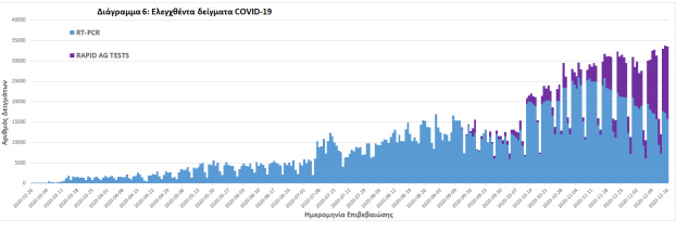 Δείγματα που έχουν ελεγχθεί: Από την 1η Ιανουαρίου 2020 μέχρι σήμερα, στα εργαστήρια που διενεργούν ελέγχους για τον νέο κορωνοϊό (SARS-CoV-2) και που δηλώνουν συστηματικά στον ΕΟΔΥ το σύνολο των δειγμάτων που ελέγχουν, έχουν συνολικά ελεγχθεί 2.640.158 κλινικά δείγματα ενώ από Μονάδες Υγείας και Κλιμάκια του ΕΟΔΥ που διενεργούν ελέγχους Rapid Ag έχουν ελεγχθεί 398.830 δείγματα.