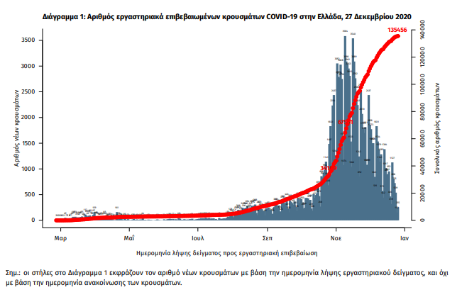 Τα στοιχεία που παρουσιάζονται αφορούν περιστατικά από την επιδημιολογική επιτήρηση της νόσου από το νέο κορωνοϊό (COVID19), με βάση τα δεδομένα που έχουν δηλωθεί στον ΕΟΔΥ και καταγραφεί μέχρι τις 27 Δεκεμβρίου 2020 (ώρα 15:00). Τα νέα εργαστηριακά επιβεβαιωμένα κρούσματα της νόσου είναι 342, εκ των οποίων 22 εντοπίστηκαν κατόπιν ελέγχων στις πύλες εισόδου της χώρας. Ο συνολικός αριθμός των κρουσμάτων ανέρχεται σε 135456 (ημερήσια μεταβολή +0.3%), εκ των οποίων 52.4% άνδρες. Οι νέοι θάνατοι ασθενών με COVID-19 είναι 53, ενώ από την έναρξη της επιδημίας έχουν καταγραφεί συνολικά 4606 θάνατοι. Η διάμεση ηλικία των ασθενών που απεβίωσαν είναι 79 έτη. Ο αριθμός των ασθενών που νοσηλεύονται διασωληνωμένοι είναι 469 (68.0% άνδρες). Η ημερήσια κατανομή των επιβεβαιωμένων κρουσμάτων είναι η ακόλουθη (η γραμμή παριστάνει την συνολική, αθροιστική κατανομή των κρουσμάτων).