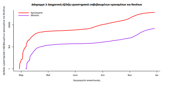 Η διαχρονική εξέλιξη των συνολικών κρουσμάτων και συνολικού αριθμού των θανάτων ασθενών COVID-19 παρουσιάζεται στο ακόλουθο διάγραμμα.