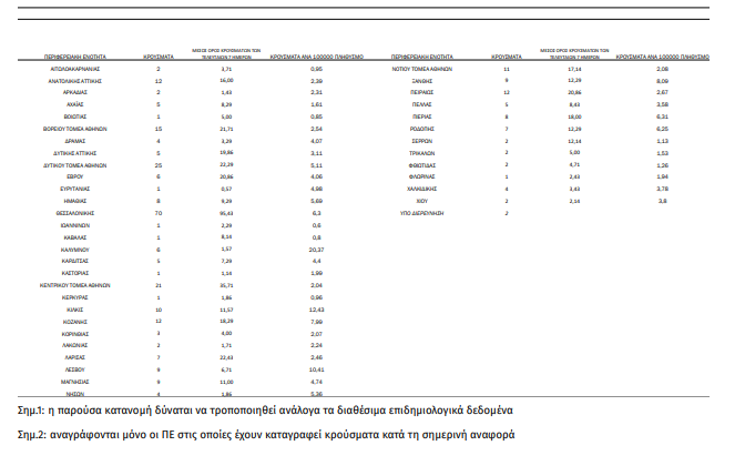 Από το σύνολο των 342 νέων κρουσμάτων του νέου ιού στη χώρα 27 είναι εισαγόμενα και 22 εντοπίστηκαν κατόπιν ελέγχων στις πύλες εισόδου της χώρας. Η κατανομή των 315 νέων εγχώριων κρουσμάτων ανά Περιφερειακή Ενότητα παρουσιάζεται στον κατωτέρω πίνακα.