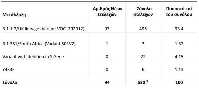 Από τον έλεγχο αναδείχθηκαν συνολικά 94 στελέχη με μεταλλάξεις ειδικού ενδιαφέροντος (variants of concern). Από τα 94 στελέχη τα 93 ήταν θετικά στη μετάλλαξη Β.1.1.7/UK lineage (Variant VOC_202012) ενώ 1 στέλεχος στη μετάλλαξη Lineage B.1.351/South Africa (Variant 501V2) (Πίνακας 3). Συνολικά έχουν ταυτοποιηθεί 495 θετικά στελέχη για την παρουσία μετάλλαξης Β.1.1.7/UK lineage (Variant VOC_202012) (Πίνακας 4) και 9 για την παρουσία μετάλλαξης B.1.351/South Africa (Variant 501V2) από την έναρξη λειτουργίας του Εθνικού Δικτύου Γονιδιωματικής Επιτήρησης για τις μεταλλάξεις του SARS-CoV-2 έως σήμερα.