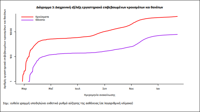 Η διαχρονική εξέλιξη των συνολικών κρουσμάτων και συνολικού αριθμού των θανάτων ασθενών COVID-19 παρουσιάζεται στο ακόλουθο διάγραμμα.