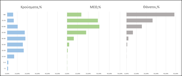 Hλικιακή κατανομή: Ακολούθως παρουσιάζεται η ηλικιακή κατανομή των (α) συνολικών κρουσμάτων, (β) των περιστατικών που κατέληξαν σε θάνατο και (γ) των ασθενών που νοσηλεύονται διασωληνωμένοι: