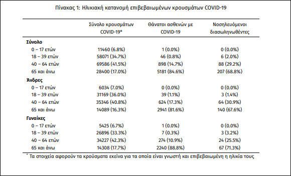 Ο αριθμός των ασθενών που νοσηλεύονται διασωληνωμένοι είναι 301 (68.4% άνδρες). Η διάμεση ηλικία τους είναι 70 έτη. To 86.7% έχει υποκείμενο νόσημα ή/και ηλικία 70 ετών και άνω. Από την αρχή της πανδημίας έχουν εξέλθει από τις ΜΕΘ 1218 ασθενείς. Η διάμεση ηλικία των κρουσμάτων είναι 44 έτη (εύρος 0.2 έως 105 έτη), ενώ η διάμεση ηλικία των θανόντων είναι 79 έτη (εύρος 15 έως 103 έτη).