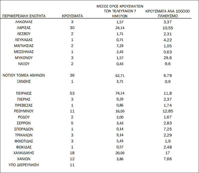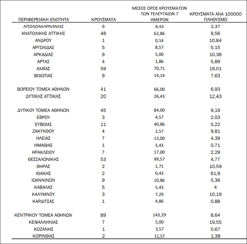 Κατανομή ανακοινωθέντων εγχώριων κρουσμάτων: Από το σύνολο των 662 νέων κρουσμάτων του νέου ιού στη χώρα 4 είναι εισαγόμενα εκ των οποίων 2 εντοπίστηκαν κατόπιν ελέγχων στις πύλες εισόδου της χώρας. Η κατανομή των 658 νέων εγχώριων κρουσμάτων ανά Περιφερειακή Ενότητα παρουσιάζεται στον κατωτέρω πίνακα.