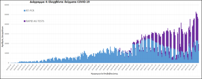 Δείγματα που έχουν ελεγχθεί: Από την 1η Ιανουαρίου 2020 μέχρι σήμερα, στα εργαστήρια που διενεργούν ελέγχους για τον νέο κορωνοϊό (SARS-CoV-2) και που δηλώνουν συστηματικά το σύνολο των δειγμάτων που ελέγχουν, έχουν συνολικά ελεγχθεί 3.379.836 κλινικά δείγματα ενώ από Μονάδες Υγείας και Κλιμάκια του ΕΟΔΥ που διενεργούν ελέγχους Rapid Ag έχουν ελεγχθεί 1.334.097 δείγματα. O μέσος όρος του επταημέρου είναι 40.949 δειγματοληπτικοί έλεγχοι.