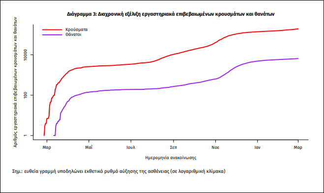 Η διαχρονική εξέλιξη των συνολικών κρουσμάτων και συνολικού αριθμού των θανάτων ασθενών COVID-19 παρουσιάζεται στο ακόλουθο διάγραμμα.