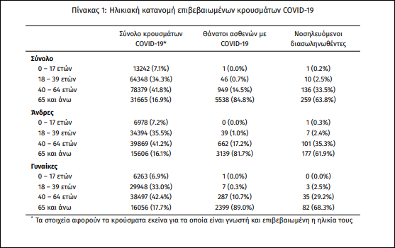 Ο αριθμός των ασθενών που νοσηλεύονται διασωληνωμένοι είναι 406 (70.4% άνδρες). Η διάμεση ηλικία τους είναι 68 έτη. To 85.0% έχει υποκείμενο νόσημα ή/και ηλικία 70 ετών και άνω. Από την αρχή της πανδημίας έχουν εξέλθει από τις ΜΕΘ 1.347 ασθενείς. Οι νέες εισαγωγές2 ασθενών Covid-19 στα νοσοκομεία της επικράτειας είναι 259 (ημερήσια μεταβολή -11.00%). Ο μέσος όρος εισαγωγών του επταημέρου είναι 292 ασθενείς. Hλικιακή κατανομή: Η διάμεση ηλικία των κρουσμάτων είναι 44 έτη (εύρος 0.2 έως 105 έτη), ενώ η διάμεση ηλικία των θανόντων είναι 79 έτη (εύρος 15 έως 103 έτη).