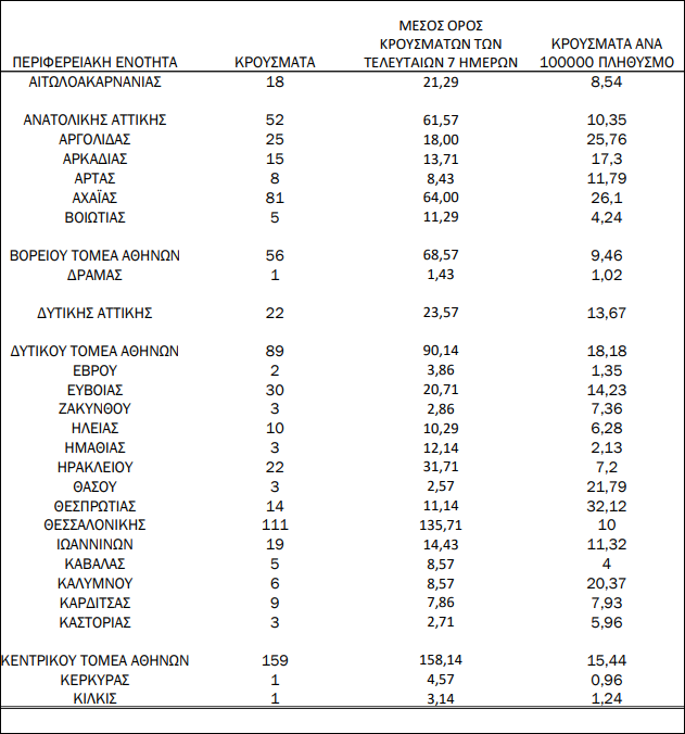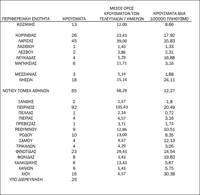 Κατανομή ανακοινωθέντων εγχώριων κρουσμάτων: Από το σύνολο των 1.176 νέων κρουσμάτων του νέου ιού στη χώρα 6 είναι εισαγόμενα εκ των οποίων 4 εντοπίστηκαν κατόπιν ελέγχων στις πύλες εισόδου της χώρας. Η κατανομή των 1.170 νέων εγχώριων κρουσμάτων ανά Περιφερειακή Ενότητα παρουσιάζεται στον κατωτέρω πίνακα.