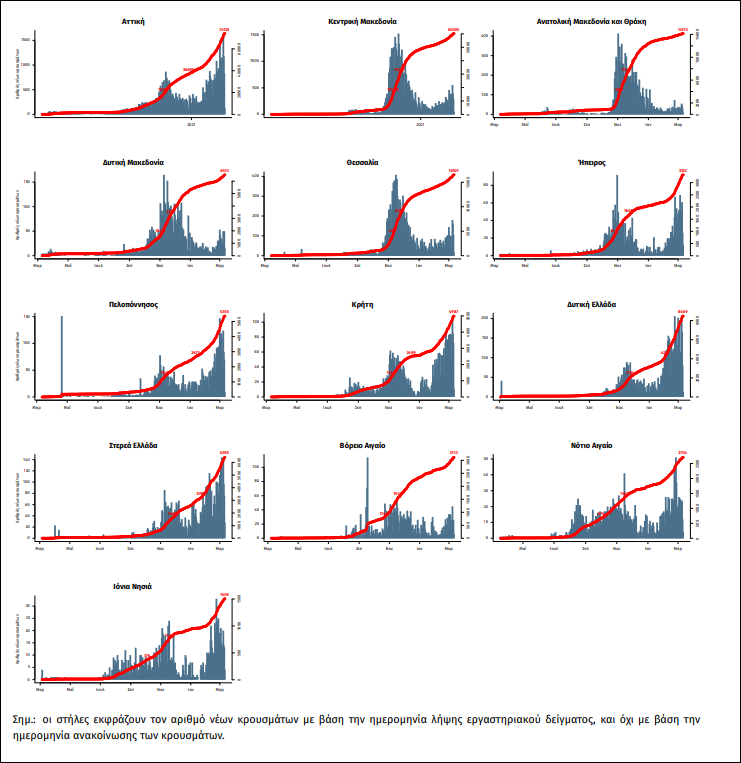 Συνολικά έχουν ταυτοποιηθεί 2.047 θετικά για την παρουσία μετάλλαξης Β.1.1.7/UK lineage (Variant VOC_202012) (Πίνακας 4) και 51 θετικά για την παρουσία μετάλλαξης B.1.351/South Africa (Variant 501.V2) από την έναρξη λειτουργίας του Εθνικού Δικτύου Γονιδιωματικής Επιτήρησης για τις μεταλλάξεις του SARS- CoV-2 έως σήμερα. Τα 51 θετικά στελέχη για την παρουσία μετάλλαξης Lineage B.1.351/South Africa (Variant 501.V2) είναι όλα εγχώρια, εκ των οποίων 43 προέρχονται από την Περιφερειακή Ενότητα Θεσσαλονίκης, 2 από την Περιφερειακή Ενότητα Ιωαννίνων, 5 από την Περιφέρεια Αττικής και ένα από την Περιφέρεια Κρήτης.