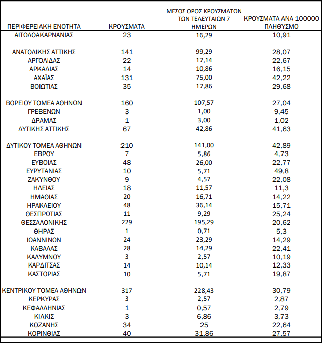 Κατανομή ανακοινωθέντων εγχώριων κρουσμάτων: Από το σύνολο των 2.570 νέων κρουσμάτων του νέου ιού στη χώρα 7 είναι εισαγόμενα εκ των οποίων 7 εντοπίστηκαν κατόπιν ελέγχων στις πύλες εισόδου της χώρας. Η κατανομή των 2.563 νέων εγχώριων κρουσμάτων ανά Περιφερειακή Ενότητα παρουσιάζεται στον κατωτέρω πίνακα.