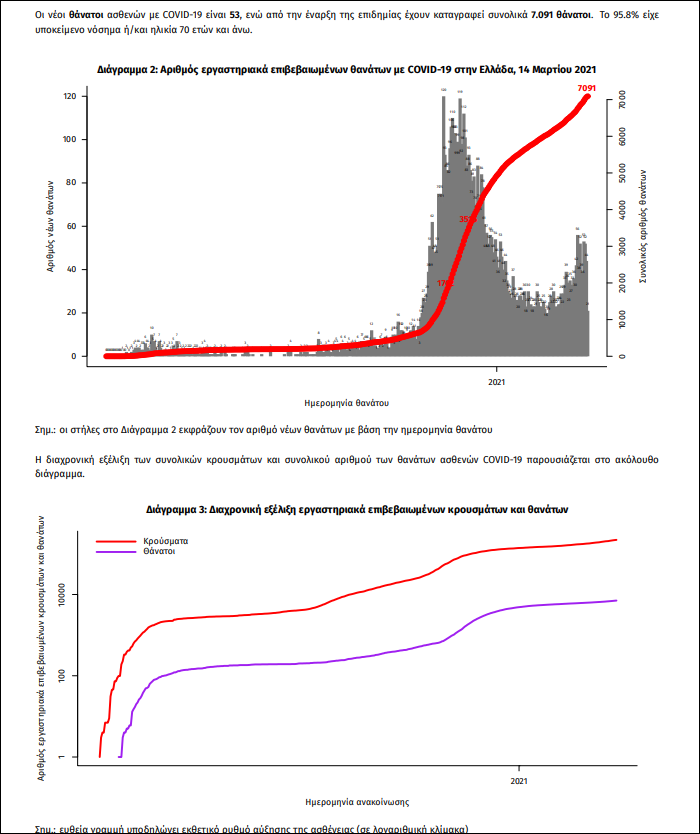 Οι νέοι θάνατοι ασθενών με COVID-19 είναι 53, ενώ από την έναρξη της επιδημίας έχουν καταγραφεί συνολικά 7.091 θάνατοι. Το 95.8% είχε υποκείμενο νόσημα ή/και ηλικία 70 ετών και άνω.