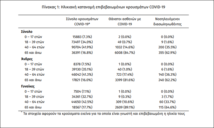 Hλικιακή κατανομή: Η διάμεση ηλικία των κρουσμάτων είναι 44 έτη (εύρος 0.2 έως 105 έτη), ενώ η διάμεση ηλικία των θανόντων είναι 79 έτη (εύρος 0 έως 103 έτη).