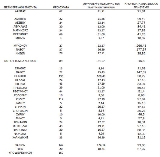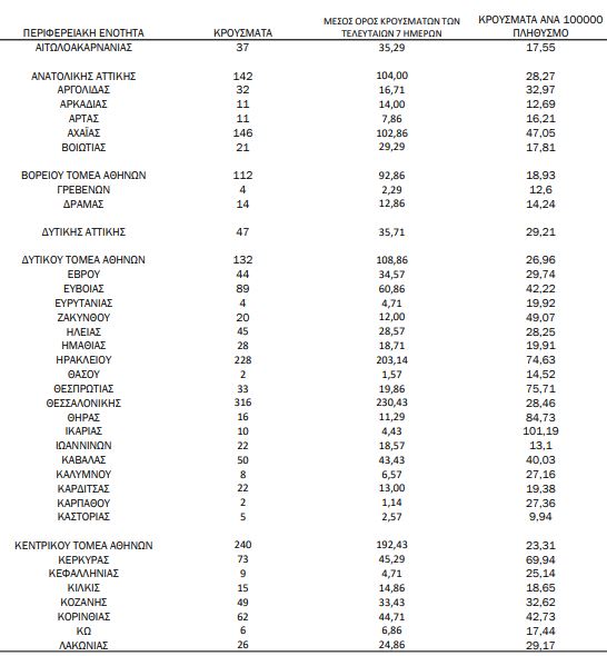 Τα νέα εργαστηριακά επιβεβαιωμένα κρούσματα της νόσου που καταγράφηκαν τις τελευταίες 24 ώρες είναι 3.493 , εκ των οποίων 9 εντοπίστηκαν κατόπιν ελέγχων στις πύλες εισόδου της χώρας. Ο συνολικός αριθμός των κρουσμάτων ανέρχεται σε 531.967 (ημερήσια μεταβολή +0.7%), εκ των οποίων 51.2% άνδρες.