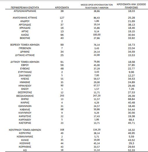 Τα νέα εργαστηριακά επιβεβαιωμένα κρούσματα της νόσου που καταγράφηκαν τις τελευταίες 24 ώρες είναι 2.840, εκ των οποίων 10 εντοπίστηκαν κατόπιν ελέγχων στις πύλες εισόδου της χώρας. Ο συνολικός αριθμός των κρουσμάτων ανέρχεται σε 593.668 (ημερήσια μεταβολή +0.5%), εκ των οποίων 51.1% άνδρες. Με βάση τα επιβεβαιωμένα κρούσματα των τελευταίων 7 ημερών, 173 θεωρούνται σχετιζόμενα με ταξίδι από το εξωτερικό και 1.456 είναι σχετιζόμενα με ήδη γνωστό κρούσμα.