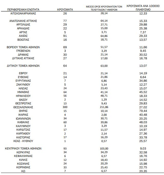 Τα νέα εργαστηριακά επιβεβαιωμένα κρούσματα της νόσου που καταγράφηκαν τις τελευταίες 24 ώρες είναι 2.132 , εκ των οποίων 18 εντοπίστηκαν κατόπιν ελέγχων στις πύλες εισόδου της χώρας. Ο συνολικός αριθμός των κρουσμάτων ανέρχεται σε 611.648 (ημερήσια μεταβολή +0.3%), εκ των οποίων 51.0% άνδρες.1 Με βάση τα επιβεβαιωμένα κρούσματα των τελευταίων 7 ημερών, 185 θεωρούνται σχετιζόμενα με ταξίδι από το εξωτερικό και 2.526 είναι σχετιζόμενα με ήδη γνωστό κρούσμα.