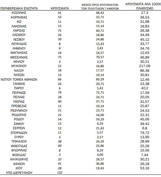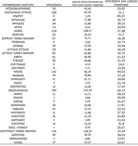 Τα νέα εργαστηριακά επιβεβαιωμένα κρούσματα της νόσου που καταγράφηκαν τις τελευταίες 24 ώρες είναι 2.871, εκ των οποίων 9 εντοπίστηκαν κατόπιν ελέγχων στις πύλες εισόδου της χώρας. Ο συνολικός αριθμός των κρουσμάτων ανέρχεται σε 590.832 (ημερήσια μεταβολή +0.5%), εκ των οποίων 51.1% άνδρες. Με βάση τα επιβεβαιωμένα κρούσματα των τελευταίων 7 ημερών, 185 θεωρούνται σχετιζόμενα με ταξίδι από το εξωτερικό και 1.378 είναι σχετιζόμενα με ήδη γνωστό κρούσμα. To για την επικράτεια βάσει των κρουσμάτων εκτιμάται σε 0.99 (95% ΔΕ: 0.89 – 1.11).