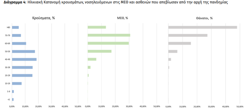 Ακολούθως παρουσιάζεται η ηλικιακή κατανομή των (α) συνολικών κρουσμάτων, (β) των περιστατικών που κατέληξαν σε θάνατο και (γ) των ασθενών που νοσηλεύονται διασωληνωμένοι: