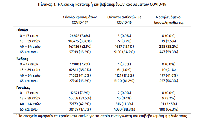 Ο αριθμός των ασθενών που νοσηλεύονται διασωληνωμένοι είναι 754 (63.0% άνδρες). Η διάμεση ηλικία τους είναι 67 έτη. To 82.6% έχει υποκείμενο νόσημα ή/και ηλικία 70 ετών και άνω. Από την αρχή της πανδημίας έχουν εξέλθει από τις ΜΕΘ 2.153 ασθενείς. Οι εισαγωγές2 νέων ασθενών Covid-19 στα νοσοκομεία της επικράτειας είναι 370 (ημερήσια μεταβολή +0.27%). Ο μέσος όρος εισαγωγών του επταημέρου είναι 395 ασθενείς.Η διάμεση ηλικία των κρουσμάτων είναι 44 έτη (εύρος 0.2 έως 106 έτη), ενώ η διάμεση ηλικία των θανόντων είναι 78 έτη (εύρος 0.2 έως 106 έτη).