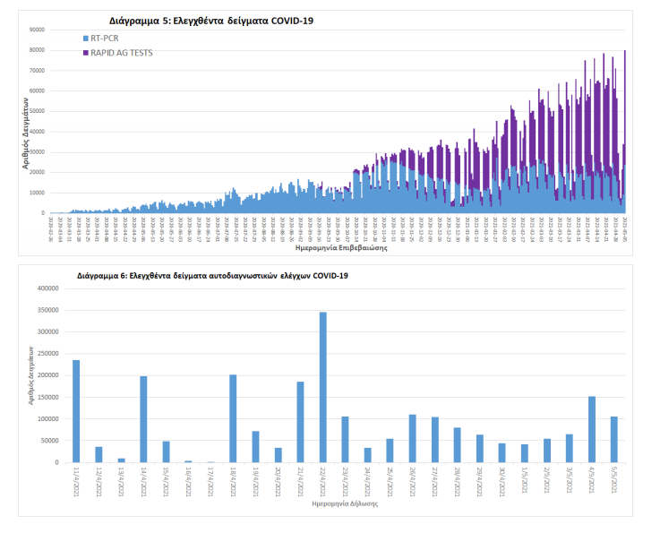 Δείγματα που έχουν ελεγχθεί: Από την 1η Ιανουαρίου 2020 μέχρι σήμερα, στα εργαστήρια που διενεργούν ελέγχους για τον νέο κορωνοϊό (SARS-CoV-2) και που δηλώνουν συστηματικά το σύνολο των δειγμάτων που ελέγχουν, έχουν συνολικά ελεγχθεί 4.718.204 κλινικά δείγματα ενώ από Μονάδες Υγείας και Κλιμάκια του ΕΟΔΥ που διενεργούν ελέγχους Rapid Ag έχουν ελεγχθεί 3.606.731 δείγματα. O μέσος όρος του επταημέρου είναι 35.035 δειγματοληπτικοί έλεγχοι. Αυτοδιαγνωστικοί έλεγχοι (Self-tests): Έως 05 Μαΐου 2021, έχουν καταγραφεί ηλεκτρονικά 2.391.693 δηλώσεις αποτελέσματος αυτοδιαγνωστικού ελέγχου, ενώ 63.376 άτομα προσήλθαν για επανέλεγχο. Mαζικές Δειγματοληψίες ΕΟΔΥ: Στις 05 Μαΐου 2021, πραγματοποιήθηκαν 121 δράσεις δειγματοληπτικών ελέγχων από τις Κινητές Ομάδες Υγείας (ΚΟΜΥ) του ΕΟΔΥ, στις οποίες διενεργήθηκαν 22.113 έλεγχοι Rapid Ag και ανευρέθηκαν 417 θετικά (1,89%).