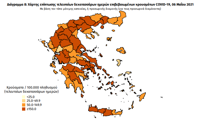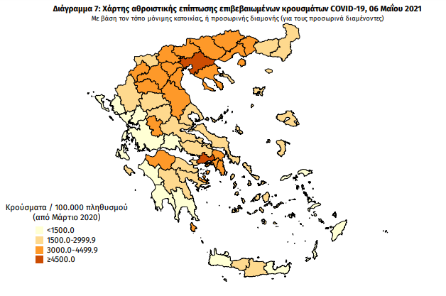 Πίνακας 2: Ημερήσιος αριθμός και κρούσματα ανά 100.000 πληθυσμού επιβεβαιωμένων εγχώριων κρουσμάτων COVID-19 ανά περιφερειακή ενότητα στις 06 Μαΐου 2021