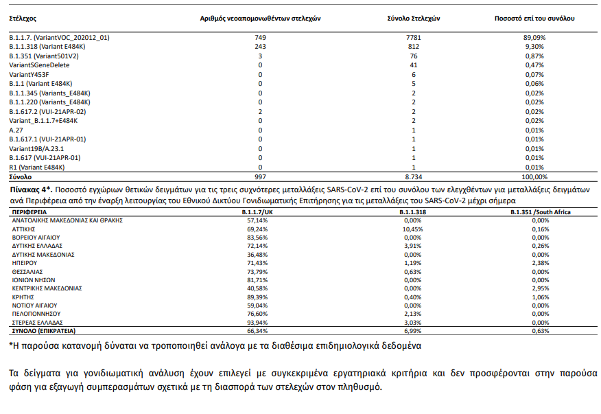 Ολοκληρώθηκε η γονιδιωματική ανάλυση σε 1.058 επιλεγμένα δείγματα που αφορούν στην περίοδο 29 Μαρτίου έως 28 Απριλίου 2021. Από τον έλεγχο των 1.058 δειγμάτων, αναδείχθηκαν συνολικά 752 δείγματα με στελέχη μεταλλάξεων ειδικού ενδιαφέροντος (Variants Of Concern – VOC) και 245 δείγματα με στελέχη υπό διερεύνηση (Variants Under Investigation – VUI). Εκ των 752 δειγμάτων με στελέχη μεταλλάξεων ειδικού ενδιαφέροντος, τα 749 αφορούσαν τη μετάλλαξη Β.1.1.7/UK lineage (Variant VOC_202012) και 3 αφορούσαν τη μετάλλαξη B.1.351/South Africa (Variant 501.V2), ενώ από τα 245 δείγματα με στελέχη VUI, τα 243 αφορούσαν το στέλεχος B.1.1.318 (Variant_E484K) και 2 αφορούσαν το στέλεχος Β.1.617.2 (VUI-21APR-01) (Πίνακας 3).