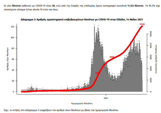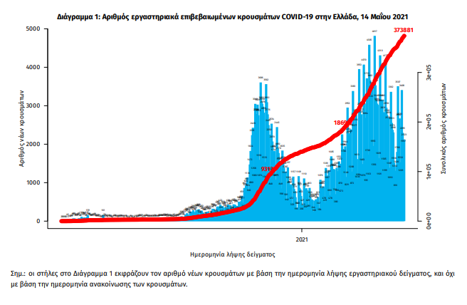 Τα στοιχεία που παρουσιάζονται αφορούν περιστατικά από την επιδημιολογική επιτήρηση της νόσου από το νέο κορωνοϊό (COVID19), με βάση τα δεδομένα που έχουν δηλωθεί στον ΕΟΔΥ και καταγραφεί μέχρι τις 14 Μαΐου 2021 (ώρα 15:00). Τα νέα εργαστηριακά επιβεβαιωμένα κρούσματα της νόσου που καταγράφηκαν τις τελευταίες 24 ώρες είναι 2.188, εκ των οποίων 5 εντοπίστηκαν κατόπιν ελέγχων στις πύλες εισόδου της χώρας. Ο συνολικός αριθμός των κρουσμάτων ανέρχεται σε 373.881 (ημερήσια μεταβολή +0.6%), εκ των οποίων 51.2% άνδρες. Με βάση τα επιβεβαιωμένα κρούσματα των τελευταίων 7 ημερών, 50 θεωρούνται σχετιζόμενα με ταξίδι από το εξωτερικό και 2.629 είναι σχετιζόμενα με ήδη γνωστό κρούσμα. Ημερήσια εξέλιξη της πανδημίας: Η ημερήσια κατανομή των επιβεβαιωμένων κρουσμάτων είναι η ακόλουθη (η γραμμή παριστάνει την συνολική, αθροιστική κατανομή των κρουσμάτων).