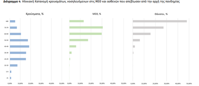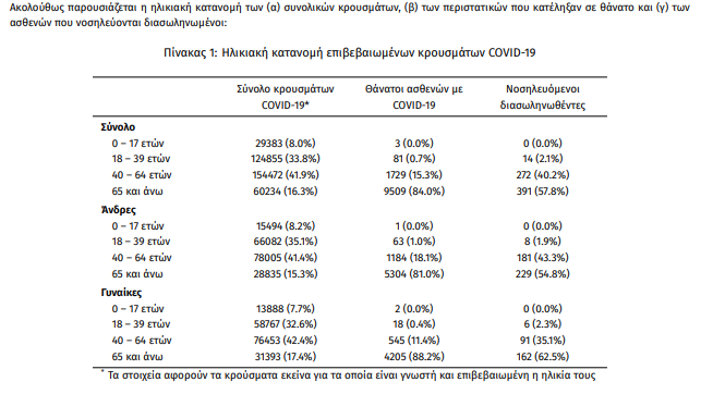 Ο αριθμός των ασθενών που νοσηλεύονται διασωληνωμένοι είναι 677 (62.0% άνδρες). Η διάμεση ηλικία τους είναι 67 έτη. To 83.0% έχει υποκείμενο νόσημα ή/και ηλικία 70 ετών και άνω. Από την αρχή της πανδημίας έχουν εξέλθει από τις ΜΕΘ 2.255 ασθενείς. Οι εισαγωγές1 νέων ασθενών Covid-19 στα νοσοκομεία της επικράτειας είναι 381 (ημερήσια μεταβολή +30.03%). Ο μέσος όρος εισαγωγών του επταημέρου είναι 344 ασθενείς.Η διάμεση ηλικία των κρουσμάτων είναι 44 έτη (εύρος 0.2 έως 106 έτη), ενώ η διάμεση ηλικία των θανόντων είναι 78 έτη (εύρος 0.2 έως 106 έτη).