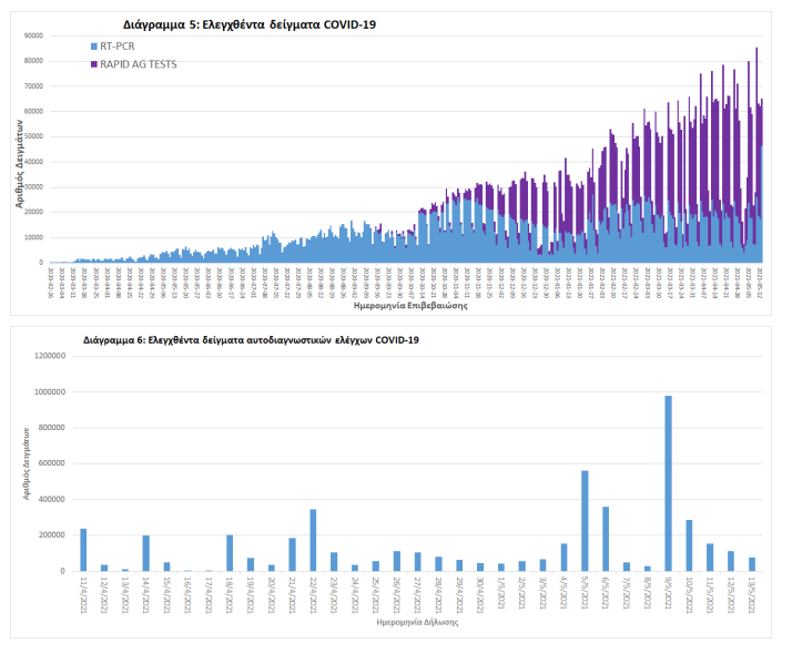 Δείγματα που έχουν ελεγχθεί: Από την 1η Ιανουαρίου 2020 μέχρι σήμερα, στα εργαστήρια που διενεργούν ελέγχους για τον νέο κορωνοϊό (SARS-CoV-2) και που δηλώνουν συστηματικά το σύνολο των δειγμάτων που ελέγχουν, έχουν συνολικά ελεγχθεί 4.876.916 κλινικά δείγματα ενώ από Μονάδες Υγείας και Κλιμάκια του ΕΟΔΥ που διενεργούν ελέγχους Rapid Ag έχουν ελεγχθεί 3.895.894 δείγματα. O μέσος όρος του επταημέρου είναι 55.153 δειγματοληπτικοί έλεγχοι. Αυτοδιαγνωστικοί έλεγχοι (Self-tests): Έως 13 Μαΐου 2021, έχουν καταγραφεί ηλεκτρονικά 4.883.978 δηλώσεις αποτελέσματος αυτοδιαγνωστικού ελέγχου, ενώ 129.596 άτομα προσήλθαν για επανέλεγχο. Mαζικές Δειγματοληψίες ΕΟΔΥ: Στις 13 Μαΐου 2021, πραγματοποιήθηκαν 142 δράσεις δειγματοληπτικών ελέγχων από τις Κινητές Ομάδες Υγείας (ΚΟΜΥ) του ΕΟΔΥ, στις οποίες διενεργήθηκαν 20.524 έλεγχοι Rapid Ag και ανευρέθηκαν 342 θετικά (1,67%).