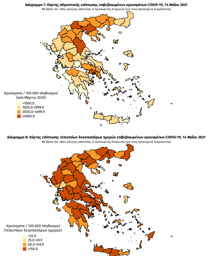 Πίνακας 2: Ημερήσιος αριθμός και κρούσματα ανά 100.000 πληθυσμού επιβεβαιωμένων εγχώριων κρουσμάτων COVID-19 ανά περιφερειακή ενότητα στις 14 Μαΐου 2021