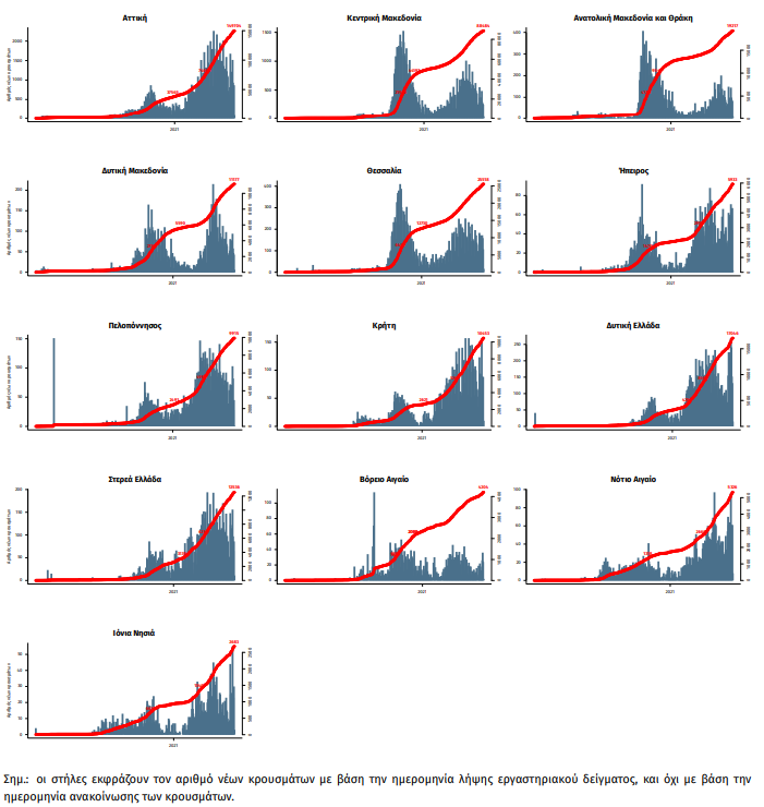 Παράρτημα 1: Επιδημικές καμπύλες κρουσμάτων COVID-19 με βάση την δηλωθείσα διεύθυνση μόνιμης κατοικίας του κρούσματος ή τη διεύθυνση προσωρινής διαμονής για τους τουρίστες και άλλους προσωρινά διαμένοντες στην Ελλάδα. Συμπεριλαμβάνονται τόσο κρούσματα με ιστορικό ταξιδίου όσο και κρούσματα με πιθανή εγχώρια μετάδοση.