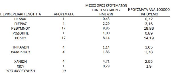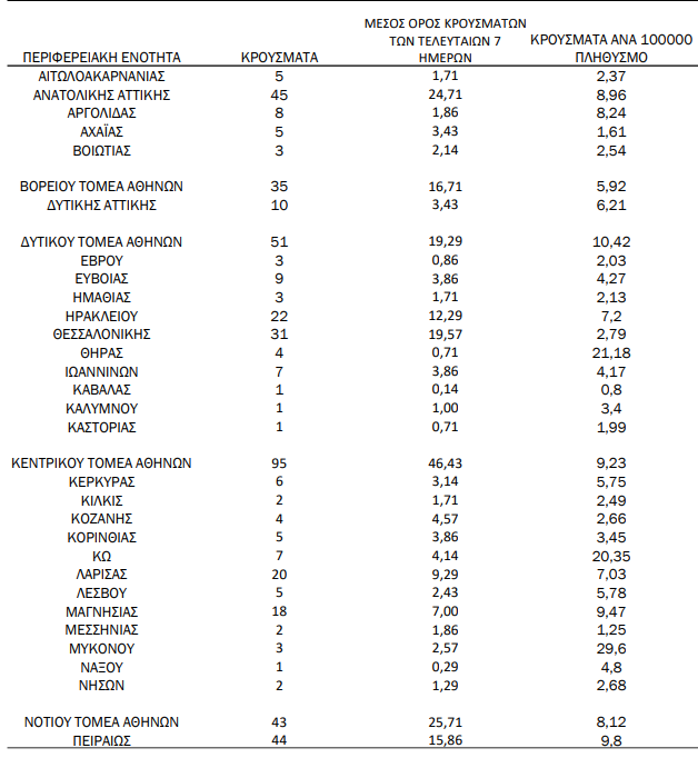 Από τα 605 κρούσματα, τα 325 βρέθηκαν στην Αττική, τα 31 στη Θεσσαλονίκη και σε κάθε περιφέρεια εντοπίστηκαν ως εξής: