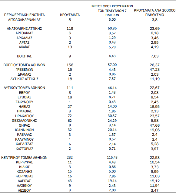 Από τα 1.797 κρούσματα, τα 1.026 βρέθηκαν στην Αττική, τα 198 στη Θεσσαλονίκη και σε κάθε περιφέρεια εντοπίστηκαν ως εξής: