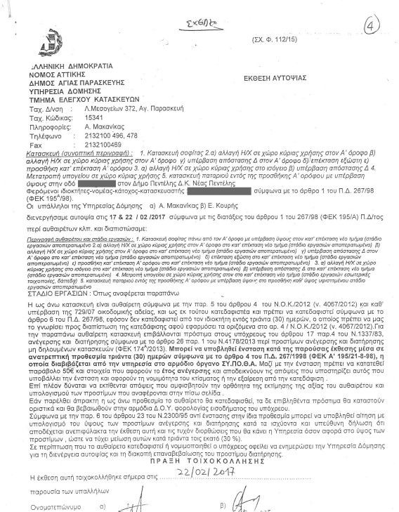 Αφού κρίθηκε κατεδαφιστέο ο συντονιστής της Αποκεντρωμένης Διοίκησης Αττικής μου έστειλε ταχυδρομικώς την έγκριση κατεδάφισης. Με αυτό λοιπόν το έγγραφο είχα το δικαίωμα να πάω στην Δήμαρχο Πεντέλης και να του γκρεμίσω το σπίτι. Ωστόσο, εμπιστεύθηκα λάθος δικηγόρο ο οποίος κράτησε το πρωτότυπο έγγραφο και δεν μου το έδωσε ποτέ πίσω, ούτε το πήγε στην Δήμαρχο Πεντέλης για να προχωρήσει η κατεδάφιση. Έτσι ο γείτονας μου και οι αστυνομικοί συνέχισαν να με απειλούν».