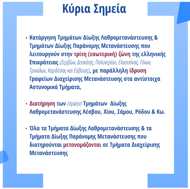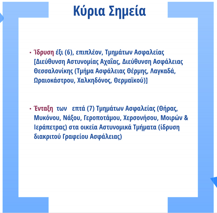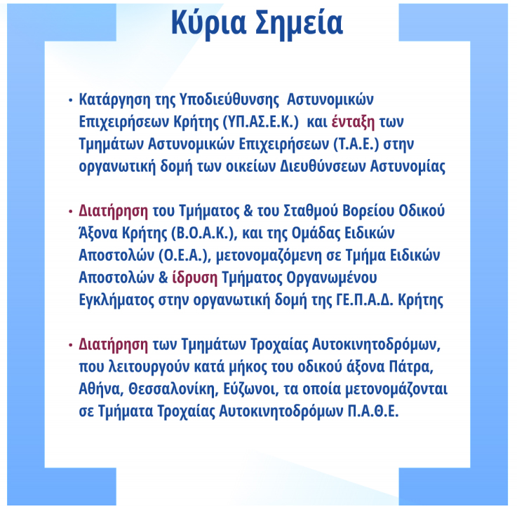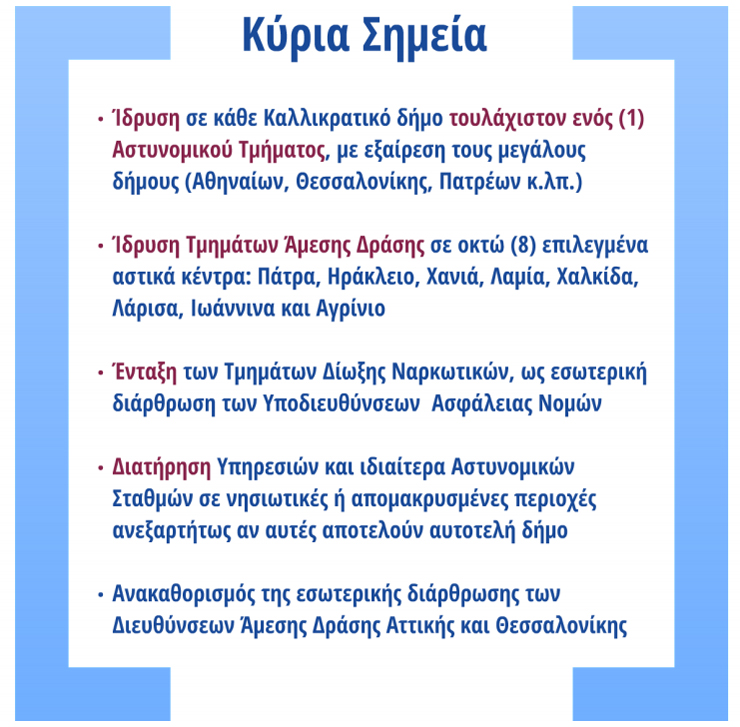 Ενδεικτικά αναφέρεται πως από τα 91 τμήματα ασφαλείας στην Αττική μένουν τα 71 και από τα περίπου 123 αστυνομικά τμήματα ανοικτά θα παραμείνουν τα 87. Οι αστυνομικοί σταθμοί θα είναι 11 και τα τμήματα τροχαίας 15. Συνολικά στην Ελλάδα θα λειτουργήσουν 575 αστυνομικά τμήματα, τμήματα ασφαλείας, τροχαίας και τουριστικής αστυνομίας, καθώς και 105 αστυνομικοί σταθμοί.