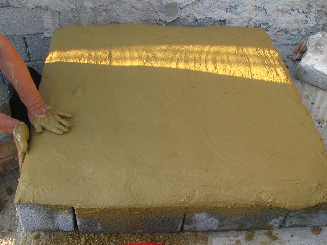 Πρώτα φτιάχνουμε τη βάση με τσιμεντόλιθα και με διάφορες πέτρες και στη συνέχεια με μέτρο ένα ταψί παίρνουμε τα μέτρα για το νέο φούρνο. Στη συνέχεια αφού πρώτα κοσκινίσουμε το χώμα, φτιάχνουμε λάσπη με χώμα και νερό και προσθέτουμε και άχυρα για μα δέσει καλύτερα το χαρμάνι. Το χαρμάνι το πατάνε οι γυναίκες με τα πόδια μέχρι να γίνει έτοιμη λάσπη. Αμέσως μετά όταν το μίγμα είναι έτοιμο, το παίρνουνε οι γυναίκες και το φτιάχνουνε μπάλες. Πετάνε τις μπάλες από χώμα με δύναμη πάνω στη βάση, και όταν αυτή γεμίσει αρχίζουνε και το χτυπάμε με την παλάμη για να γίνει ίσιο, και μετά το σκεπάζουνε γα να μην σκάσει. Όταν στεγνώσει καλά μαζεύουνε σπασμένα κεραμίδια και πετραδάκια και τα βάζουμε έτσι ώστε να γίνει κυκλικό ο θόλος του φούρνου. Όταν φτιάξουνε το θόλο τον χτυπάνε με την παλάμη τους και μετά ρίχνοντας νερό το γυαλίζουν με τα χέρια τους