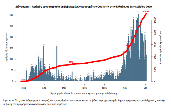 Τα στοιχεία που παρουσιάζονται αφορούν περιστατικά από την επιδημιολογική επιτήρηση της νόσου από το νέο κορωνοϊό (COVID19), με βάση τα δεδομένα που έχουν δηλωθεί στον ΕΟΔΥ και καταγραφεί μέχρι τις 03 Σεπτεμβρίου 2020 (ώρα 15:00). Τα νέα εργαστηριακά επιβεβαιωμένα κρούσματα της νόσου είναι 241, εκ των οποίων τα 31 εντοπίστηκαν κατόπιν ελέγχων στις πύλες εισόδου της χώρας. Ο συνολικός αριθμός των κρουσμάτων ανέρχεται σε 10998 (ημερήσια μεταβολή +2.2%), εκ των οποίων 55.7% άνδρες. Οι νέοι θάνατοι ασθενών με COVID-19 είναι 5, ενώ από την έναρξη της επιδημίας έχουν καταγραφεί συνολικά 278 θάνατοι. Η διάμεση ηλικία των ασθενών που απεβίωσαν είναι 78 έτη. Ο αριθμός των ασθενών που νοσηλεύονται διασωληνωμένοι είναι 39 (74.4% άνδρες). Η ημερήσια κατανομή των επιβεβαιωμένων κρουσμάτων είναι η ακόλουθη (η γραμμή παριστάνει την συνολική, αθροιστική κατανομή των κρουσμάτων).