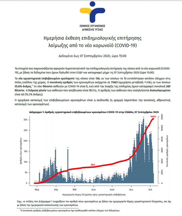 «Σήμερα ανακοινώνουμε 156 νέα κρούσματα του νέου ιού στη χώρα, εκ των οποίων τα 13 εντοπίστηκαν κατόπιν ελέγχων στις πύλες εισόδου της χώρας. Ο συνολικός αριθμός των κρουσμάτων είναι 11663, εκ των οποίων το 55.8% άνδρες.