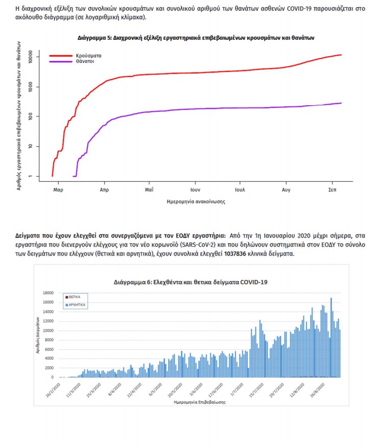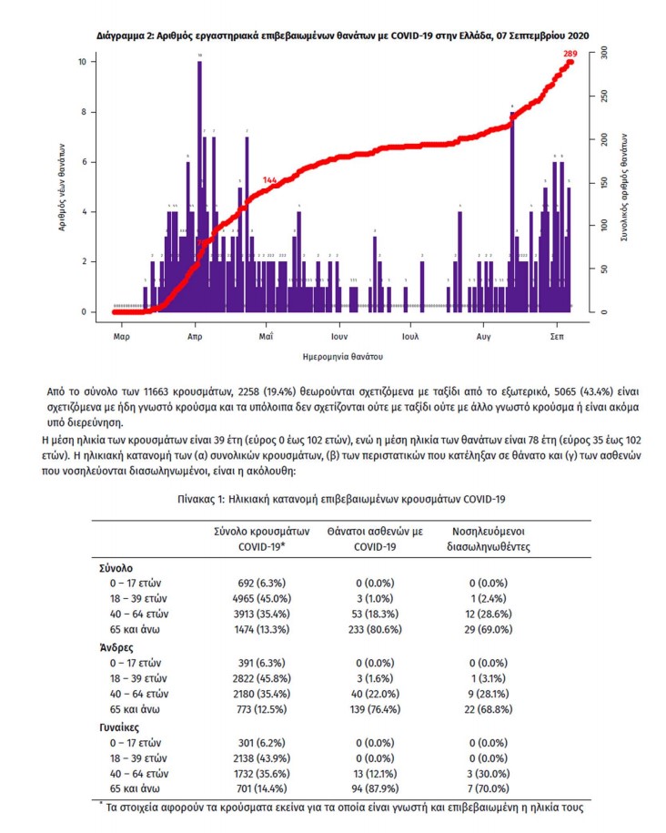 Τέλος, έχουμε 5 ακόμα καταγεγραμμένους θανάτους και 289 θανάτους συνολικά στη χώρα. 107 (37.0%) γυναίκες και οι υπόλοιποι άνδρες. Η διάμεση ηλικία των θανόντων συμπολιτών μας ήταν τα 78 έτη και το 96.2% είχε κάποιο υποκείμενο νόσημα ή/και ηλικία 70 ετών και άνω.»