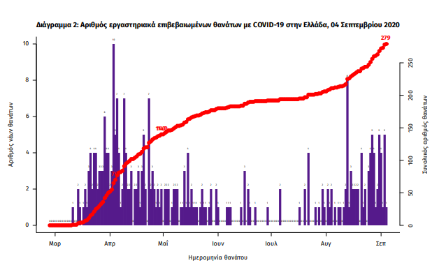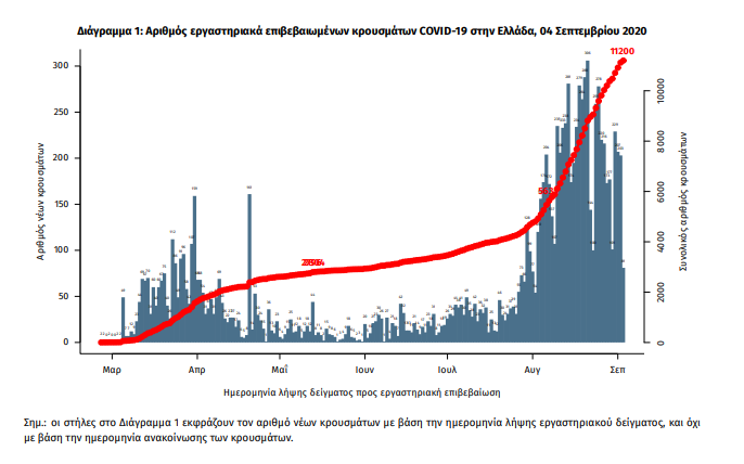 Τα στοιχεία που παρουσιάζονται αφορούν περιστατικά από την επιδημιολογική επιτήρηση της νόσου από το νέο κορωνοϊό (COVID19), με βάση τα δεδομένα που έχουν δηλωθεί στον ΕΟΔΥ και καταγραφεί μέχρι τις 04 Σεπτεμβρίου 2020 (ώρα 15:00). Τα νέα εργαστηριακά επιβεβαιωμένα κρούσματα της νόσου είναι 202, εκ των οποίων τα 9 εντοπίστηκαν κατόπιν ελέγχων στις πύλες εισόδου της χώρας. Ο συνολικός αριθμός των κρουσμάτων ανέρχεται σε 11200 (ημερήσια μεταβολή +1.8%), εκ των οποίων 55.7% άνδρες. Οι νέοι θάνατοι ασθενών με COVID-19 είναι 1, ενώ από την έναρξη της επιδημίας έχουν καταγραφεί συνολικά 279 θάνατοι. Η διάμεση ηλικία των ασθενών που απεβίωσαν είναι 78 έτη. Ο αριθμός των ασθενών που νοσηλεύονται διασωληνωμένοι είναι 38 (73.7% άνδρες). Η ημερήσια κατανομή των επιβεβαιωμένων κρουσμάτων είναι η ακόλουθη (η γραμμή παριστάνει την συνολική, αθροιστική κατανομή των κρουσμάτων).