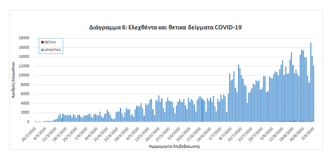 Δείγματα που έχουν ελεγχθεί στα συνεργαζόμενα με τον ΕΟΔΥ εργαστήρια: Από την 1η Ιανουαρίου 2020 μέχρι σήμερα, στα εργαστήρια που διενεργούν ελέγχους για τον νέο κορωνοϊό (SARS-CoV-2) και που δηλώνουν συστηματικά στον ΕΟΔΥ το σύνολο των δειγμάτων που ελέγχουν (θετικά και αρνητικά), έχουν συνολικά ελεγχθεί 992566 κλινικά δείγματα, εκ των οποίων τα 11176(1.12%) ήταν θετικά στον κορωνοϊό (συμπεριλαμβάνονται και περισσότερα από ένα δείγματα ανά άτομο που ελέγχθηκε).