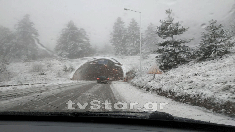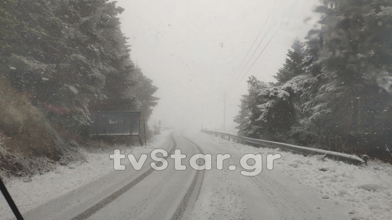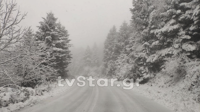 Εκδρομείς που ανεβαίνουν στο Καρπενήσι συναντούν χιόνι στο οδόστρωμα από τα όρια Φθιώτιδας-Ευρυτανίας στον Τυμφρηστό...